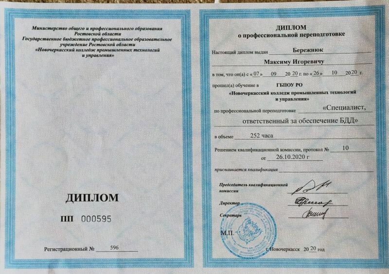 - Новочеркасский колледж промышленных технологий и управления, Специалист за обеспечение БДД, 2020 г.
