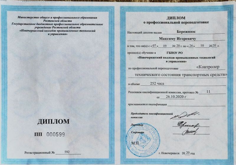 - Новочеркасский колледж промышленных технологий и управления, Контролер технического состояния транспортных средств, 2020 г.