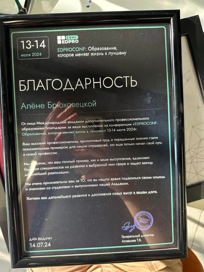 - Международная академия дополнительного образования EDPRO, благодарность за выступление на конференции, 2024 г.
