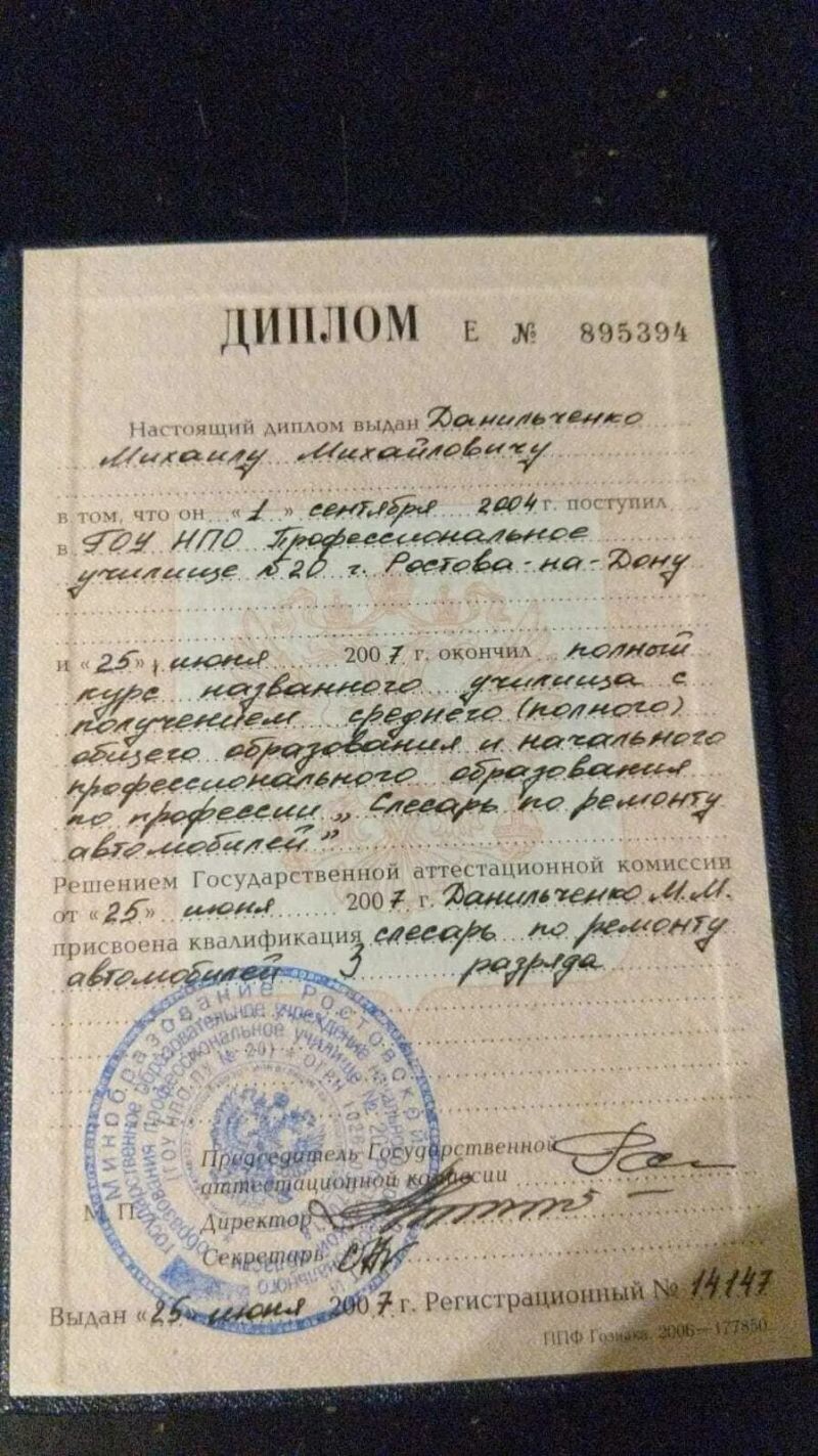 - Профессиональное училище № 20, слесарь по ремонту автомобилей, 3 разряд, 2004–2007 гг.