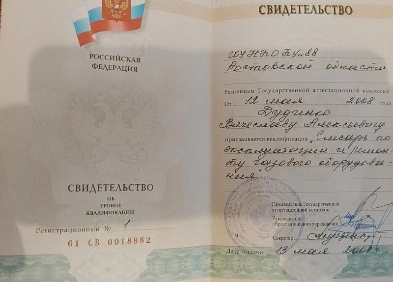 - ГОУ НПО ПУ 88 РО Слесарь по эксплуатации и ремонту газового оборудования, 2008 г.