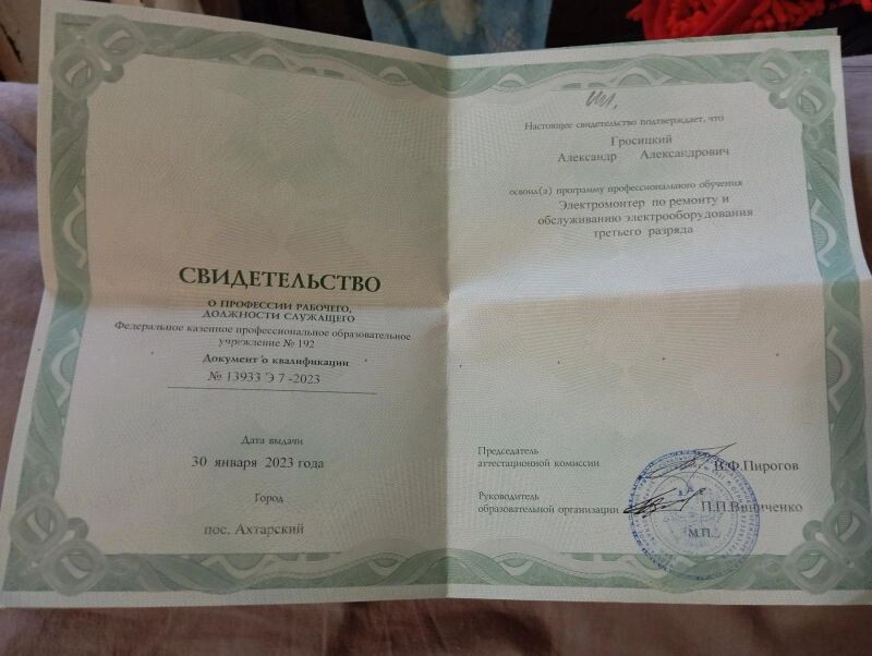 - Федеральное казённое профессиональное учреждение № 192, электромонтёр по ремонту и обслуживанию электрооборудования третьего разряда, 2022–2023 гг.