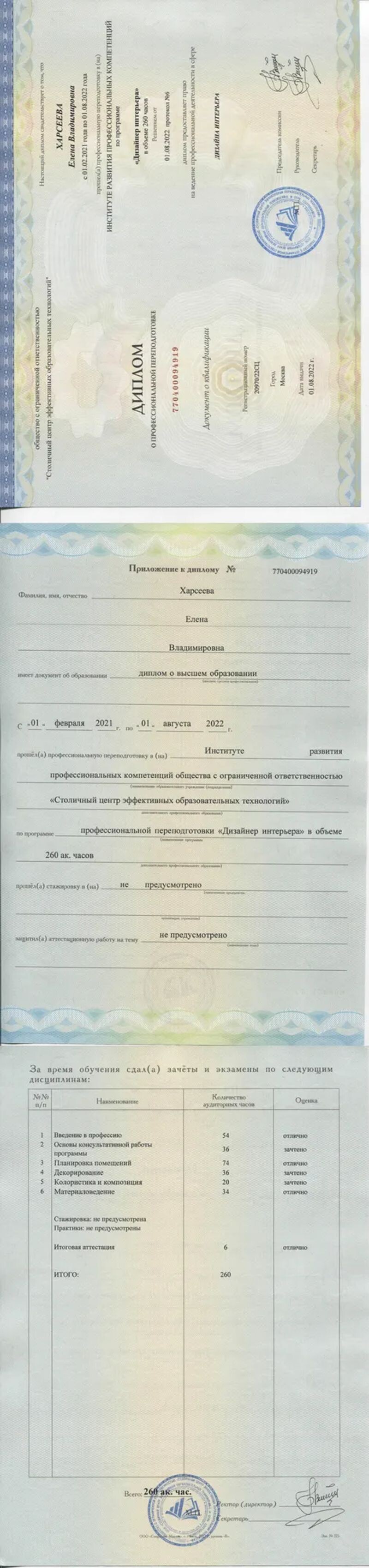 - Институт развития профессиональных компетенций, программа «Дизайнер интерьера», 2021–2022 гг.