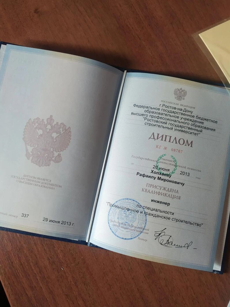 - Федеральное государственное бюджетное образовательное учреждение высшего профессионального образования «Ростовский государственный строительный университет», инженер, по специальности «Промышленное и гражданское строительство», 2008–2013 гг.