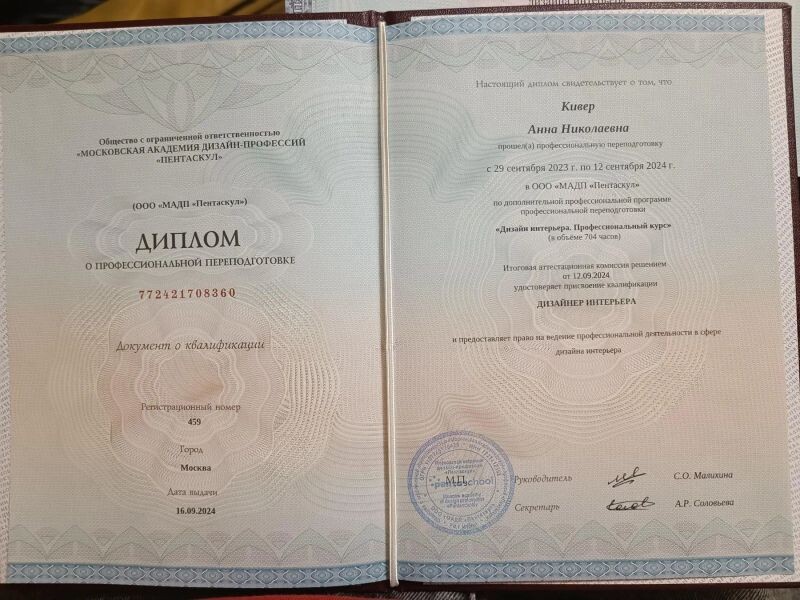 - Московская академия дизайн-профессий «Пентаскул», программа «Дизайнер интерьера. Профессиональный курс», 2023–2024 гг.