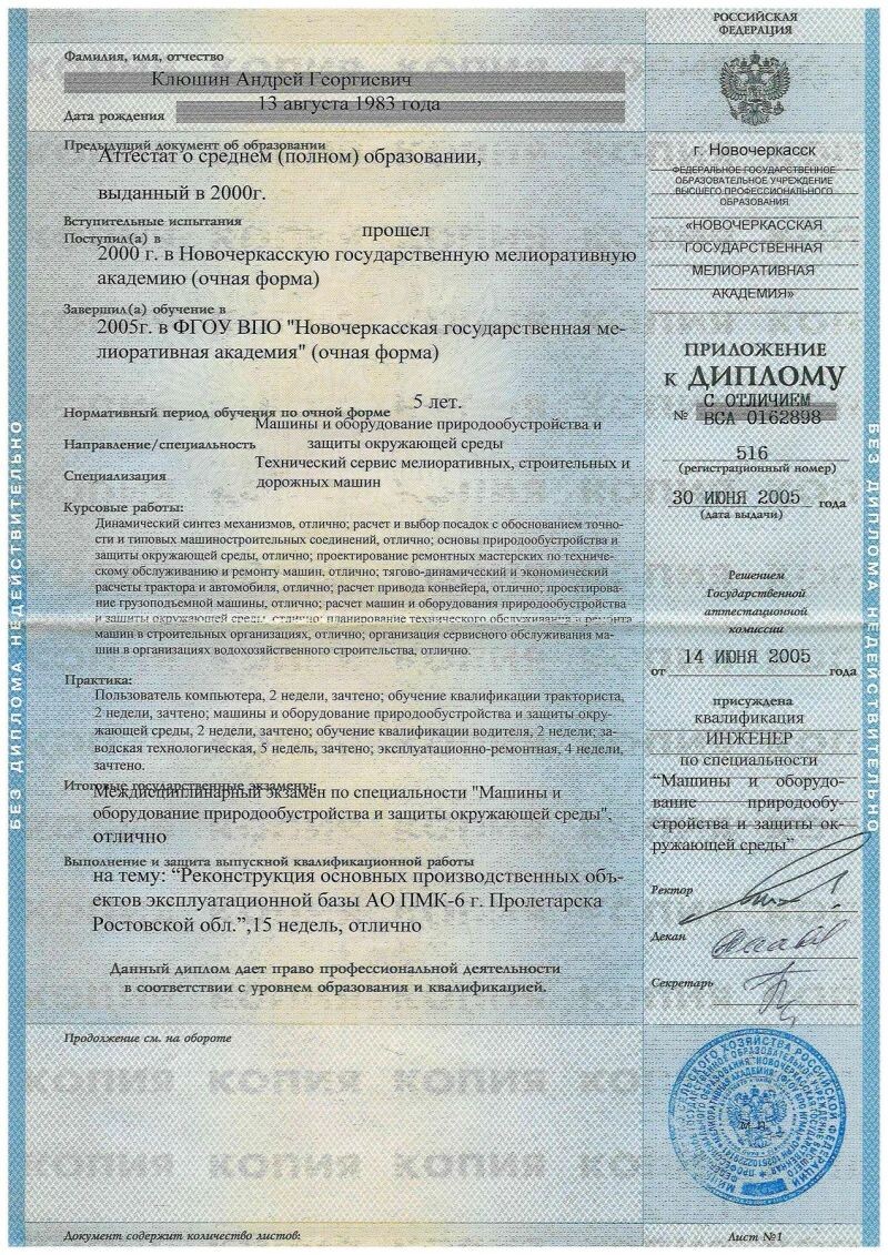 - ФГОУ ВПО «Новочеркасская государственная мелиоративная академия», инженер, 2000–2005 гг.