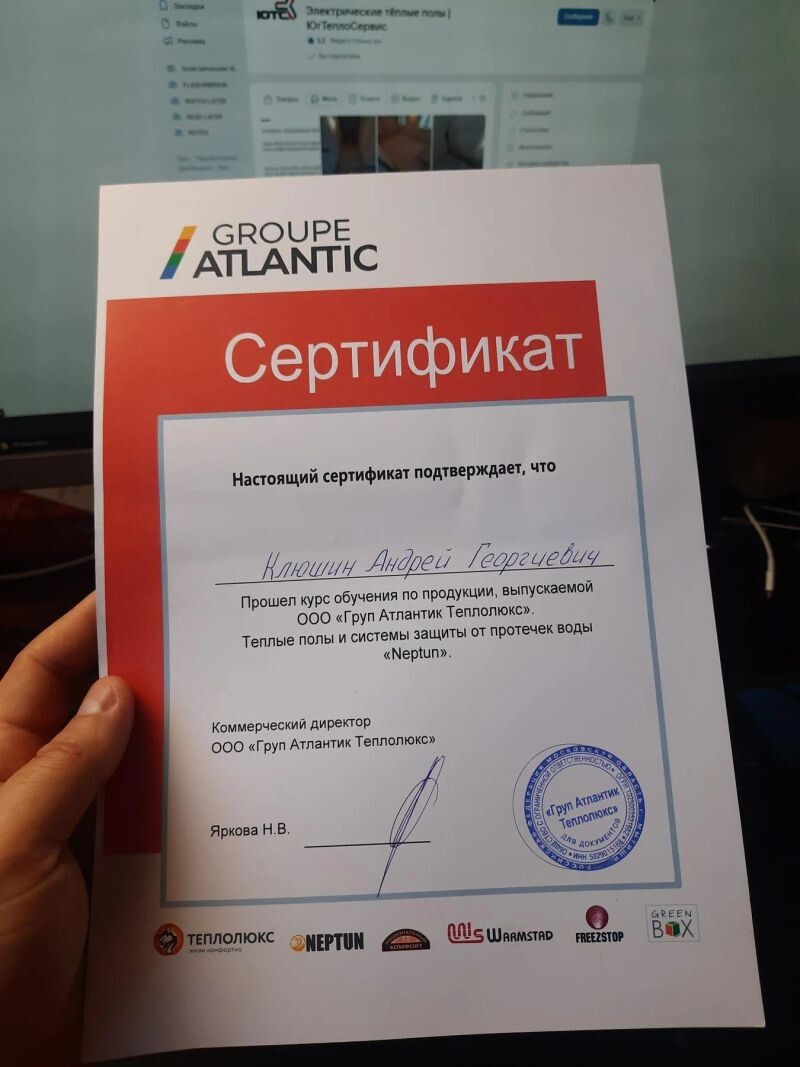 - ООО «Груп Атлантик Теплолюкс», курс обучения по продукции: тёплые полы и системы защиты от протечек воды Neptun, выпускаемой ООО «Груп Атлантик Теплолюкс», 2023 г.