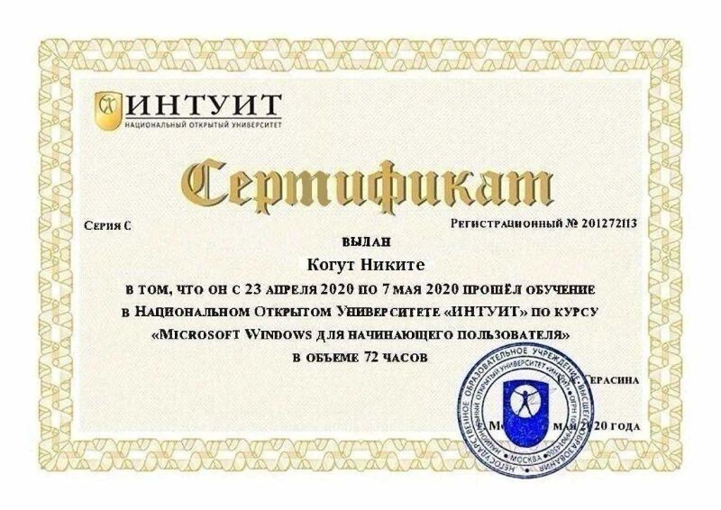 - Национальный открытый университет «Интуит», курс «Microsoft Windows для начинающего пользователя», 2020 г.