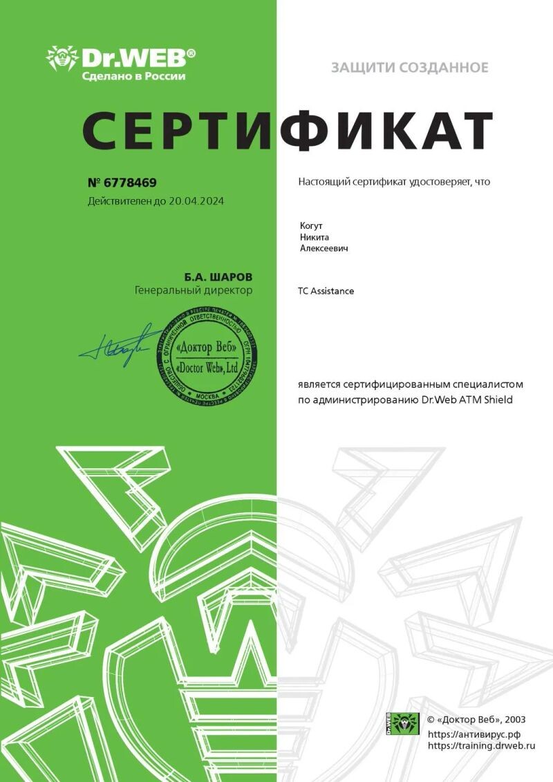 - Dr.WEB, сертифицированный специалист по администрированию Dr. Web ATM Snield, 2021 г.
