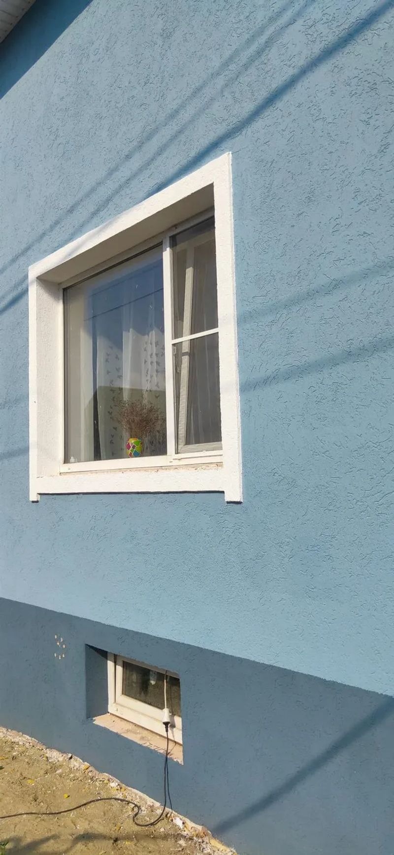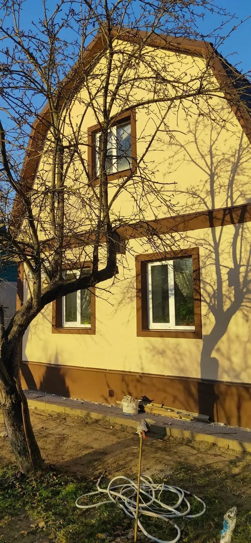 Выполнили 180м2 штукатуркой «барашек» некоторые стены утеплили, заделали огроменные щели (на минуточку дому уже 60 лет), сейчас дом выглядит современно и красиво, а также они нам сделали проводку для подстветки (на фото с фонариками видно что свет подчеркивает идеально ровный дом, а не как раньше «волнистый»)