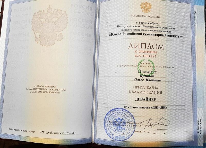 - Южно-Российский гуманитарный институт, дизайнер, 2004–2010 гг.