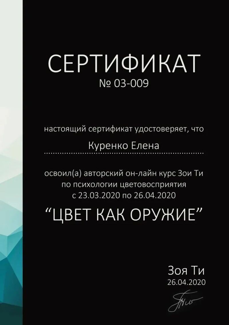 - Авторский он-лайн курс Зои Ти, «Цвет как оружие», 2020 г.