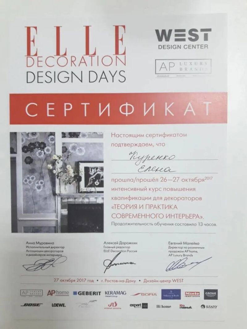- WEST DESING CENTER, курс «Теория и практика современного интерьера», 2017 г.