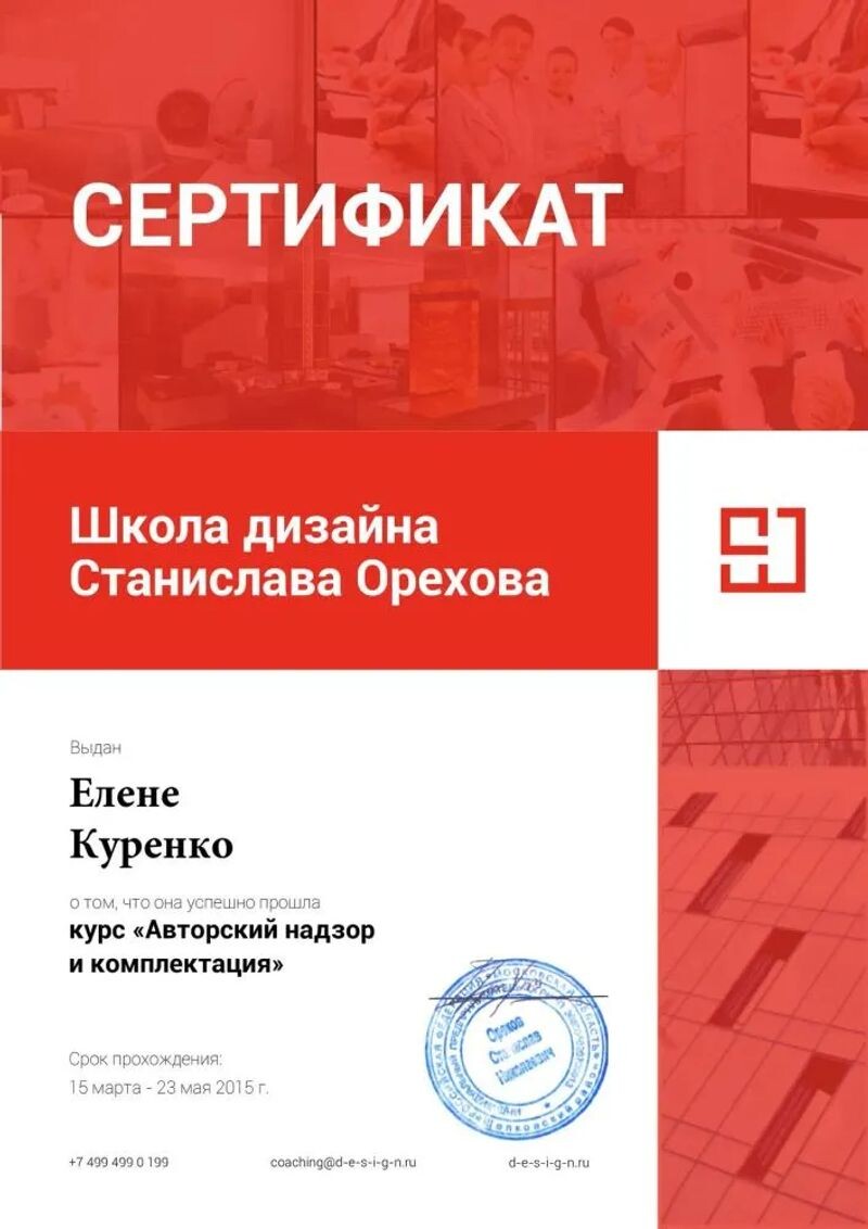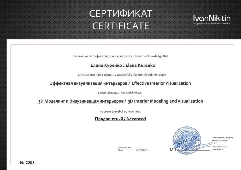 - Проходила курсы по проработке отдельных навыков в области дизайна интерьера у самых успешных российских и зарубежных дизайнеров (с 2015 г.).