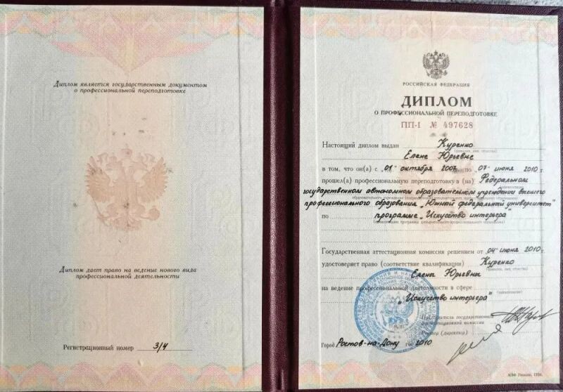 - Южный федеральный университет, искусство интерьера, 2007–2010 гг.