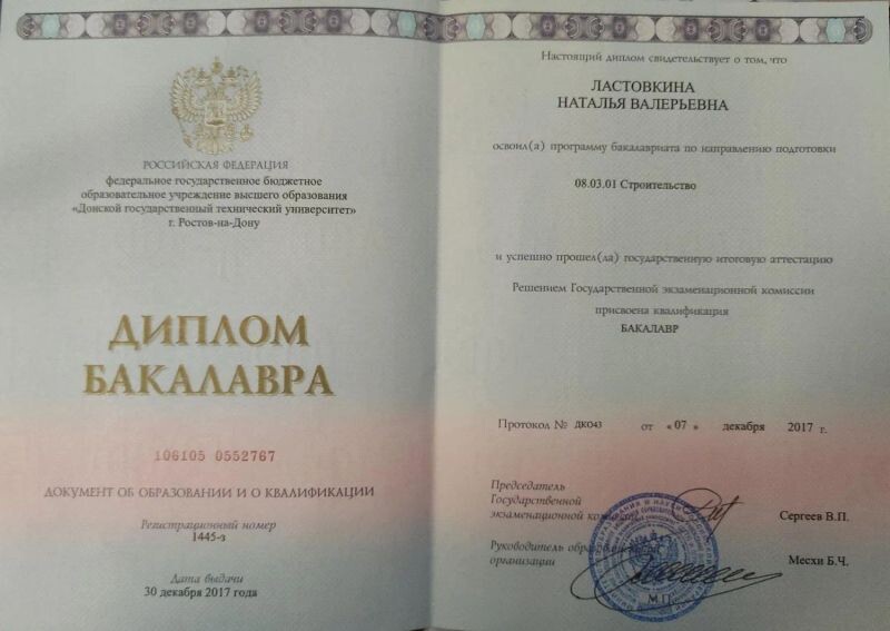 - Донской государственный технический университет г. Ростовский-на-Дону, специальность проектирования зданий, 2012–2017 гг.