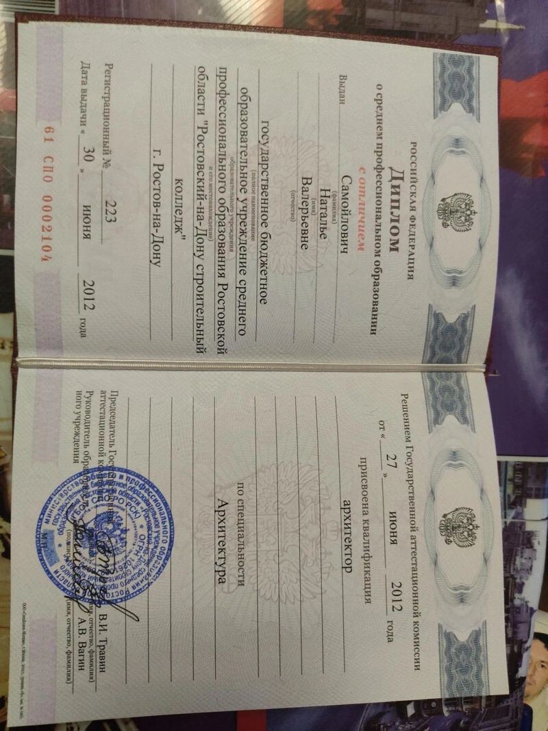 - Диплом о среднем профессиональном образовании с отличием (Ростовском-на-Дону строительный колледж), по специальности архитектура, 2008–2012 гг.