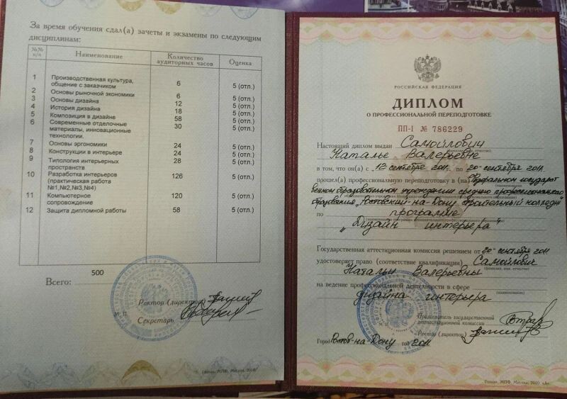 - Ростовский-на-Дону строительный колледж, специальность Дизайн интерьера, 2011 г.