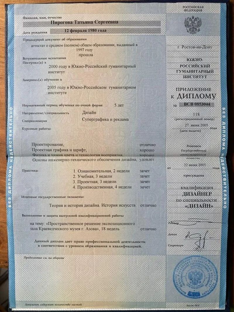 - Южно-Российский гуманитарный институт, направление «Дизайн», специализация «суперграфика и реклама», 2000–2005 гг.