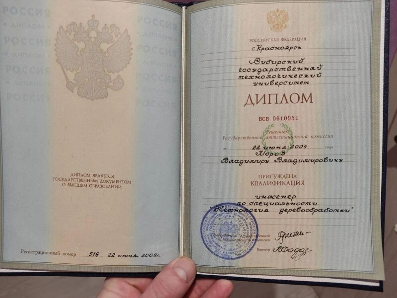 - СибГТУ, инженер по специальности «Технология деревообработки», 1999–2004 гг.