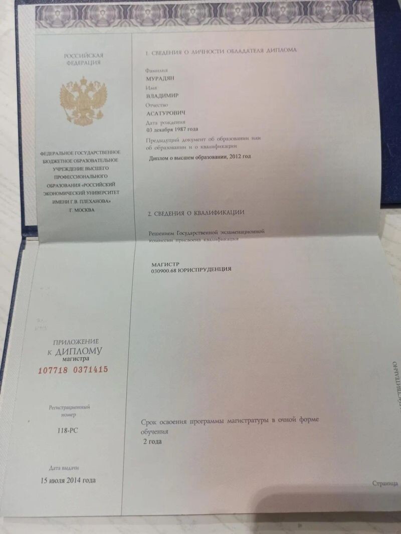 - Российский экономический университет имени Г. В. Плеханова, магистр, юриспруденция, 2012–2014 гг.