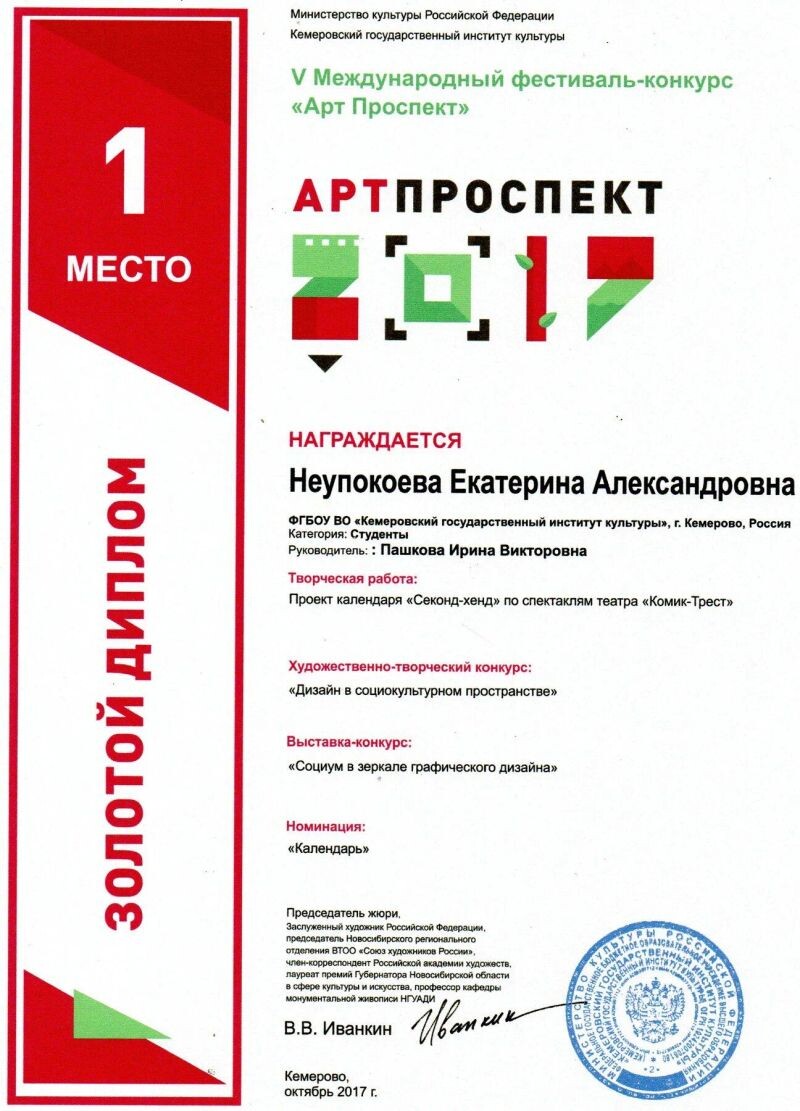 - V Международный фестиваль-конкурс «Арт Проспект», 1 место за проект календаря «Секонд-хенд» по спектаклям театра «Комик-Трест»», 2017 г.