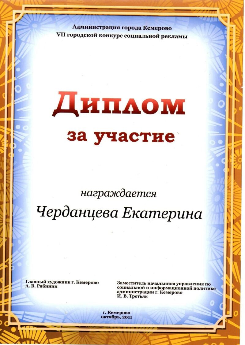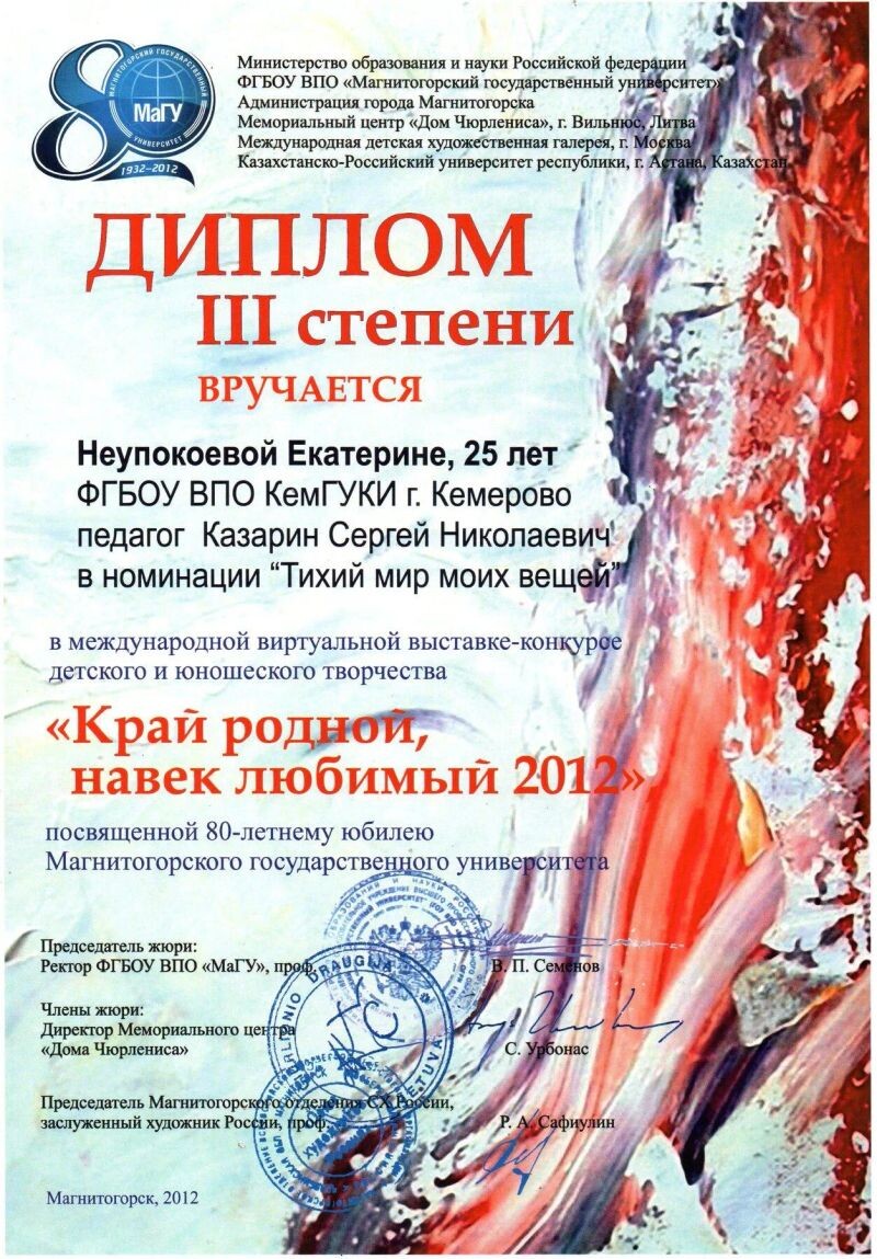 - Диплом III степени за победу в Международной виртуальной выставке-конкурсе детского и юношеского творчества «Край родной, навек любимый», г. Магнитогорск, 2012 г.