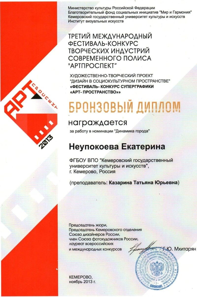 - Третий Международный фестиваль-конкурс творческих индустрий современного полиса «Артпроспект», бронзовый диплом за работу в номинации «Динамика города», 2013 г.