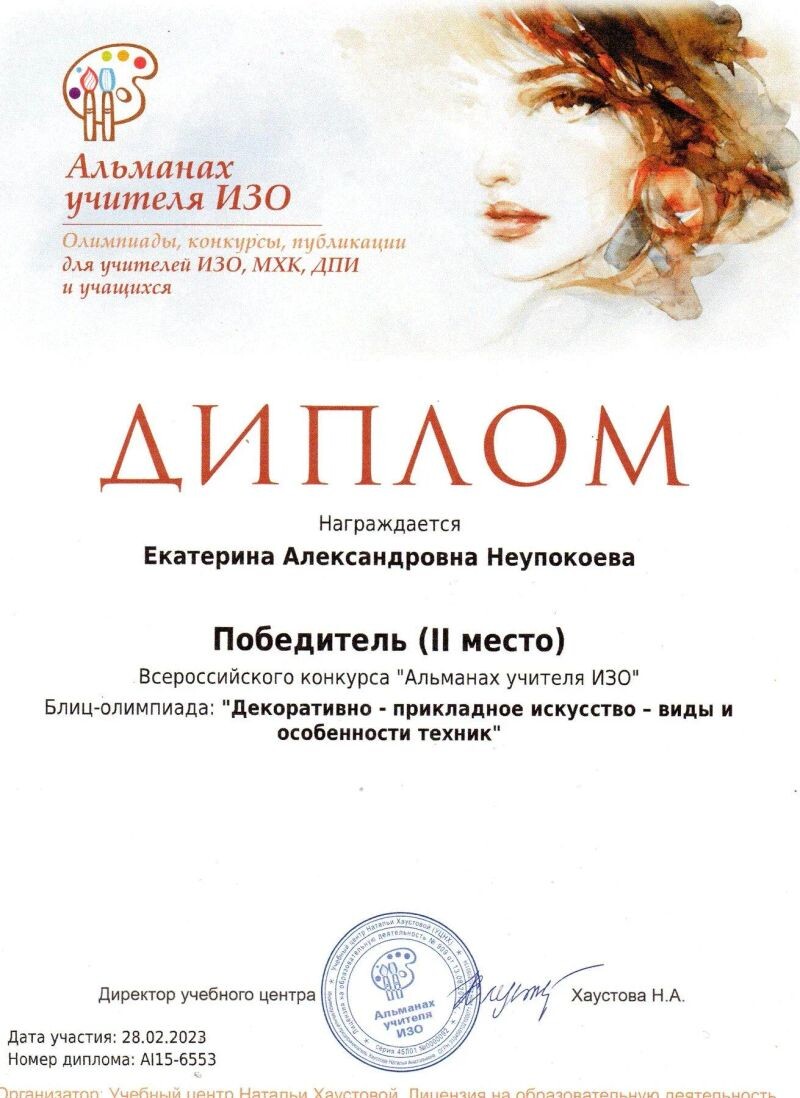 - Победитель (ІІ место) Всероссийского конкурса «Альманах учителя ИЗО», Блиц-олимпиада «Декоративно-прикладное искусство — виды и особенности техник», 2023 г.