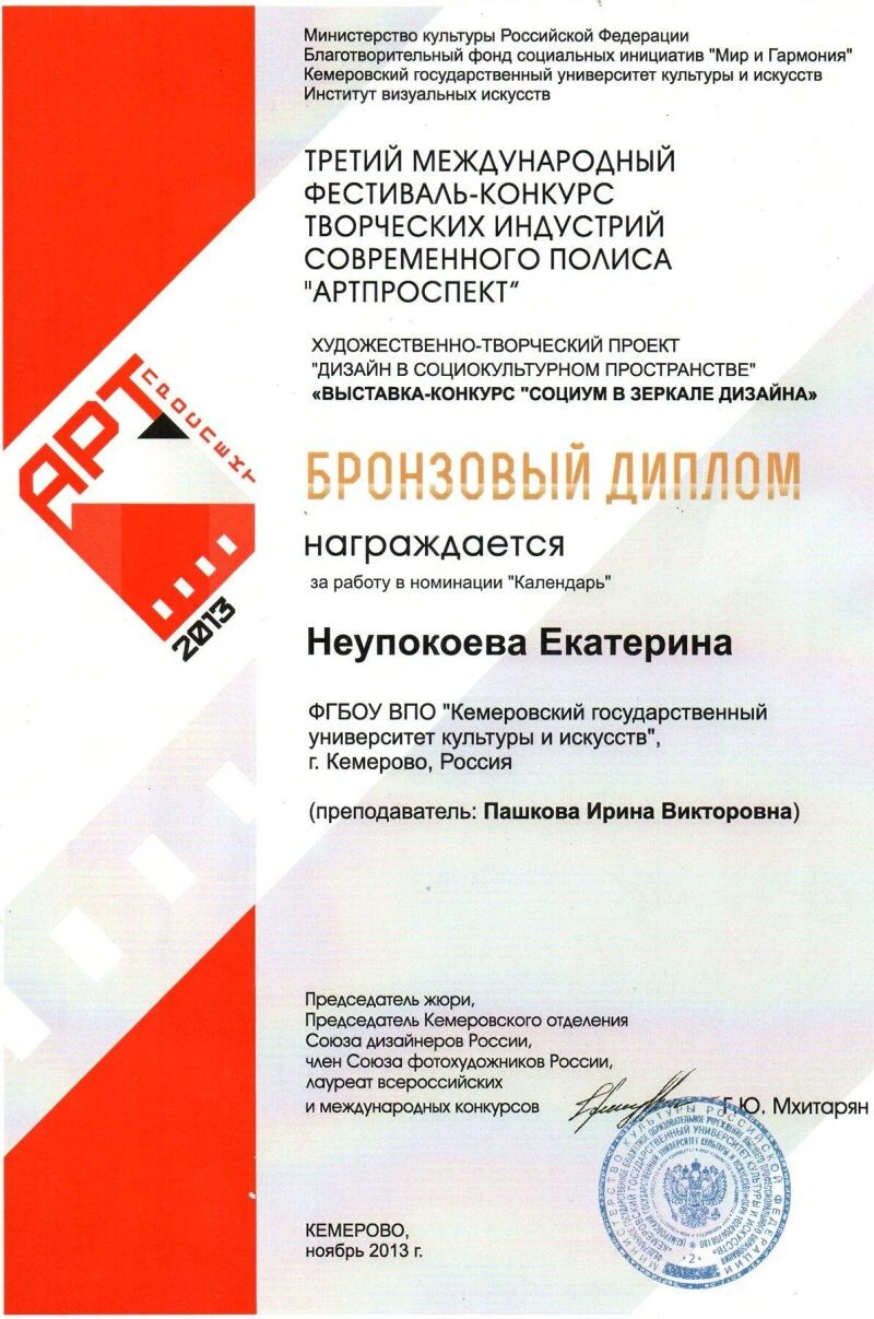 - Третий Международный фестиваль-конкурс творческих индустрий современного полиса «Артпроспект», бронзовый диплом за работу в номинации «Календарь», 2013 г.