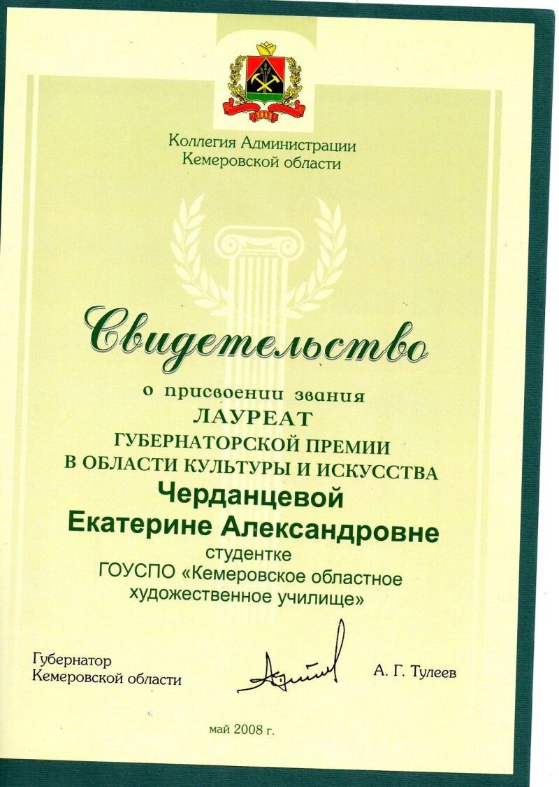- Коллегия Администрации Кемеровской области, лауреат Губернаторской премии в области культуры и искусства, 2008 г.