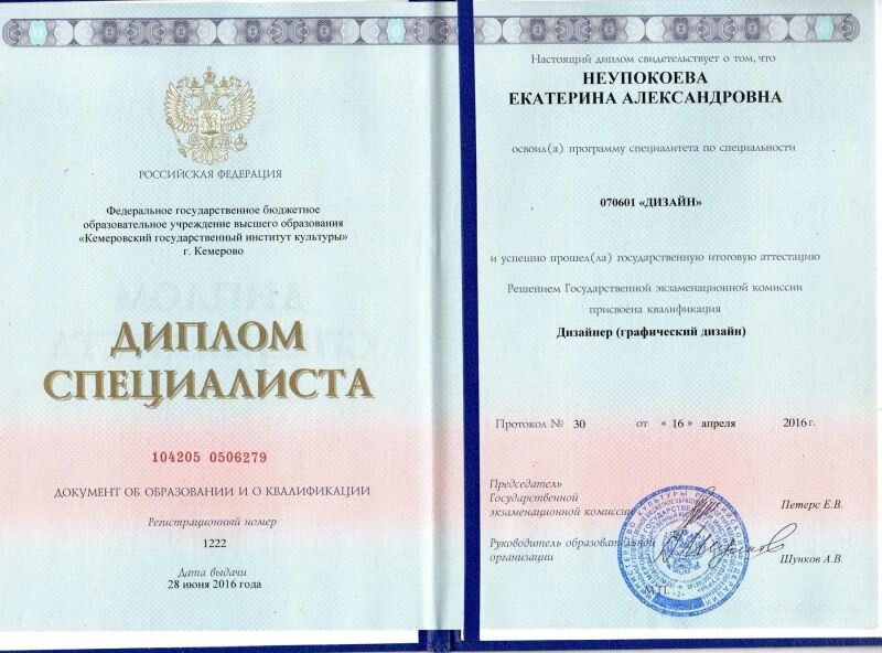 - Федеральное государственное бюджетное образовательное учреждение высшего образования «Кемеровский государственный институт культуры», дизайнер (графический дизайн), 2010–2016 гг.