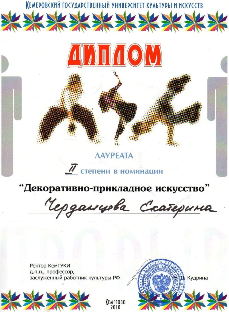 - КемГУКИ, лауреат II степени в номинации «Декоративно-прикладное искусство», 2010 г.