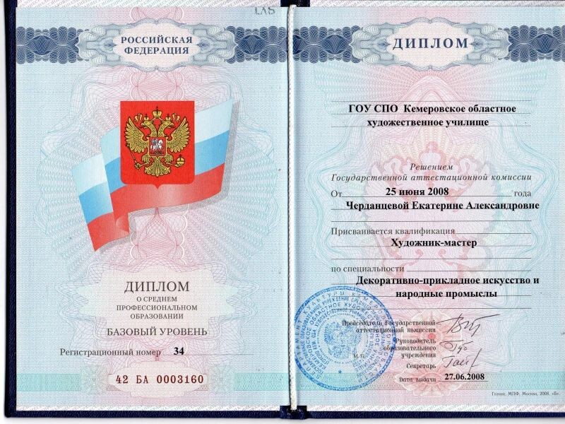 - ГОУ СПО «Кемеровское областное художественное училище», специальность «декоративно-прикладное искусство и народные промыслы», художник-мастер, 2004–2008 гг.