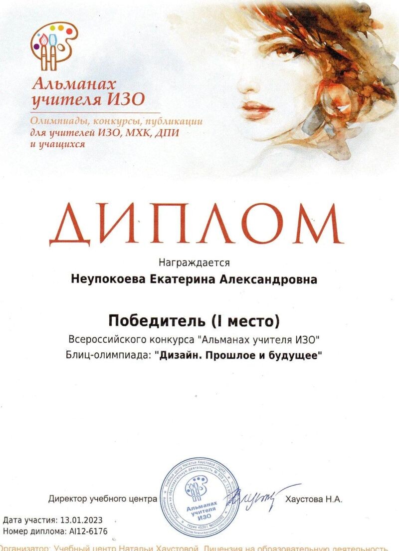 - Победитель (І место) Всероссийского конкурса «Альманах учителя ИЗО», Блиц-олимпиада «Дизайн. Прошлое и будущее», 2023 г.