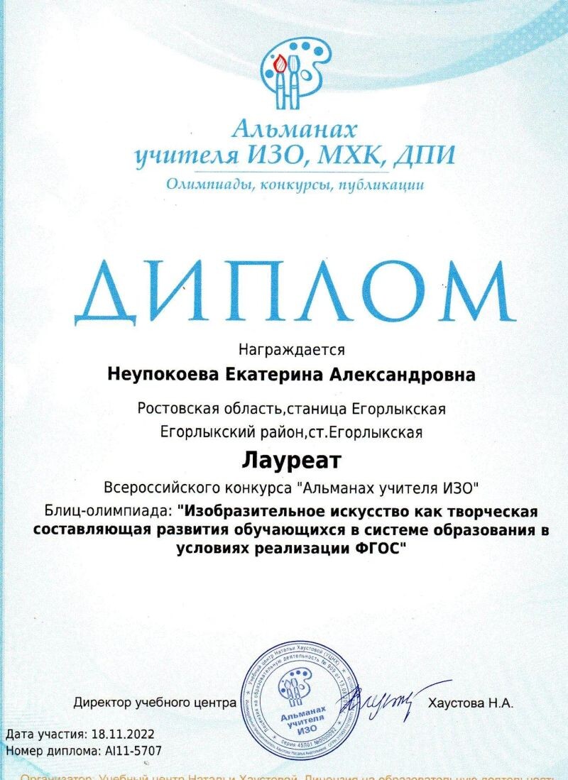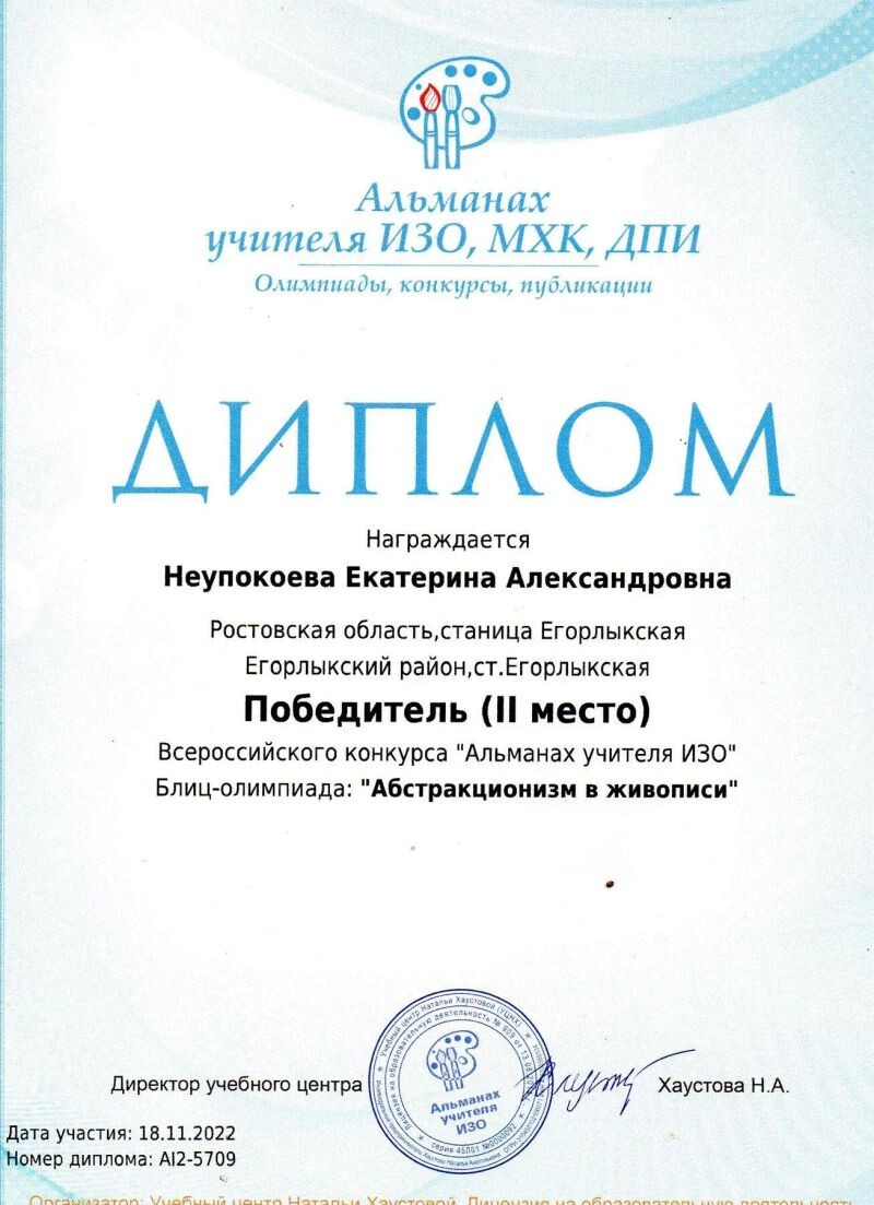 - Победитель (II место) Всероссийского конкурса «Альманах учителя ИЗО», Блиц-олимпиада «Абстракционизм в живописи», 2022 г.