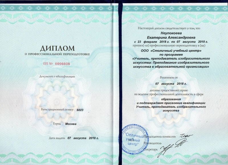 - ООО «Столичный учебный центр», программа «Учитель, преподаватель изобразительного искусства: преподавание изобразительного искусства в образовательной организации», 2018 г.