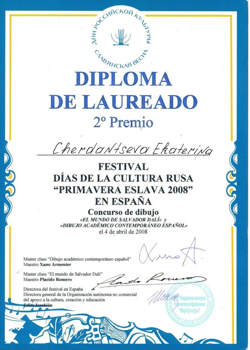 - Фестиваль «Дни российской культуры "Славянская весна"», Испания (Барселона), мастер-класс «Испанский современный академический рисунок», 2 место в конкурсе рисунков, 2008 г.