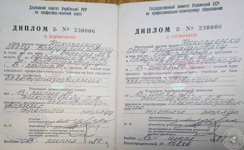 - СПТУ №45 (г. Луганск), специальность – электрогазосварщик 3 разряда (1987 г.).