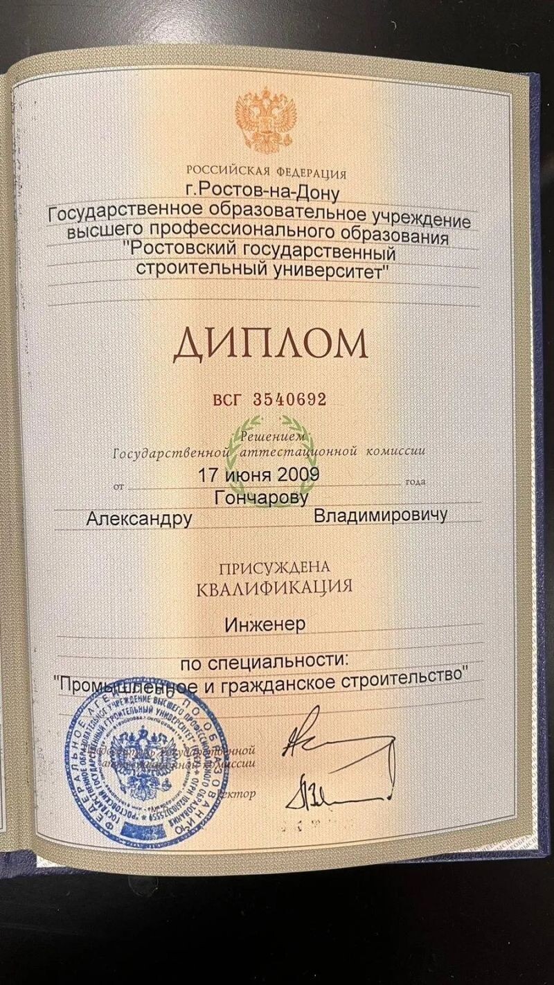 - Ростовский государственный строительный университет, промышленное и гражданское строительство, инженер, 2005–2009 гг.