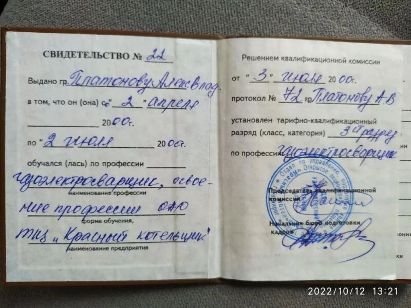 - ОАО «Красный котельщик». Газоэлектросварщик 3 разряда, 2000 г.