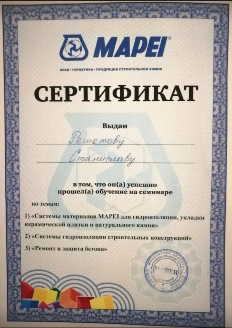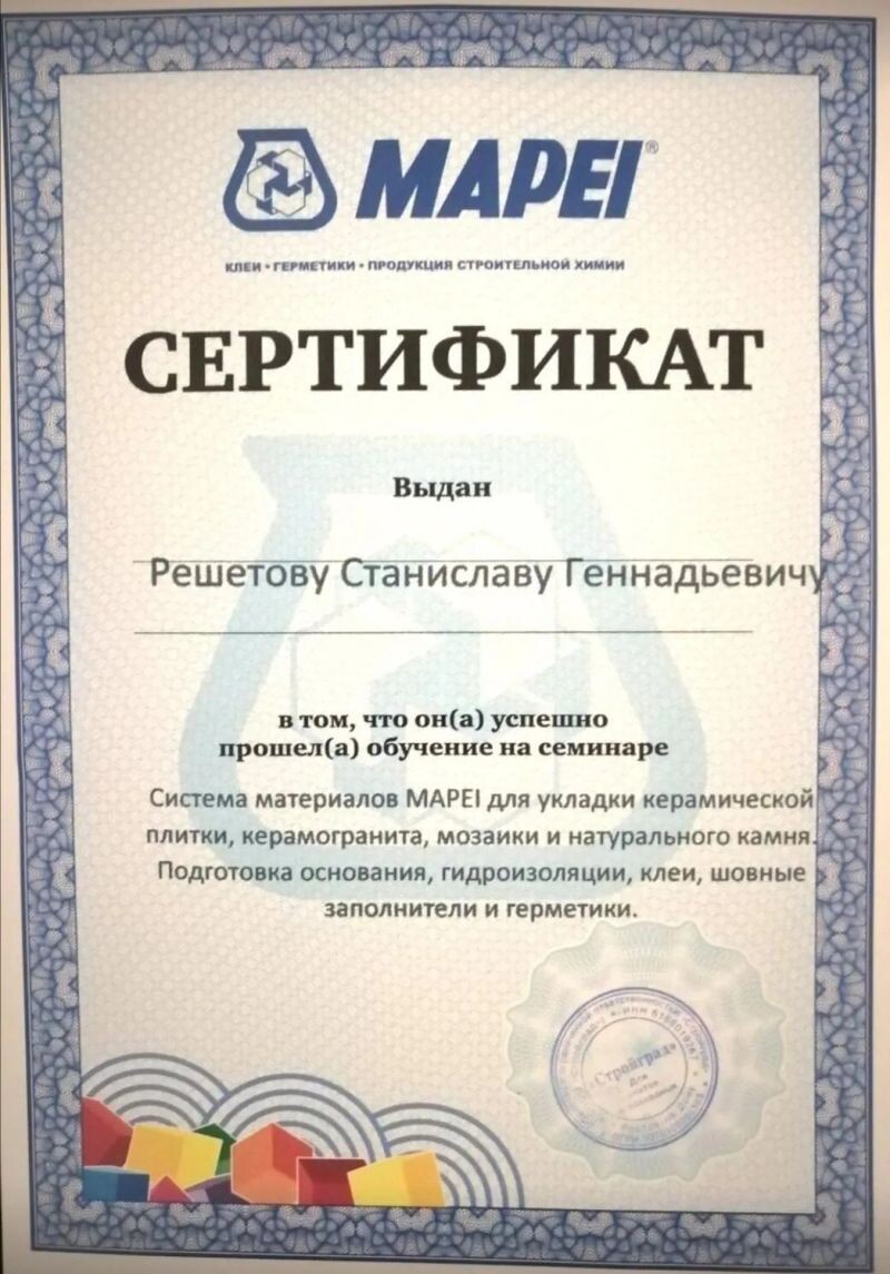 - Mapei, семинар по системе материалов для укладки керамической плитки, керамогранита, мозаики и натурального камня, 2015 г.
