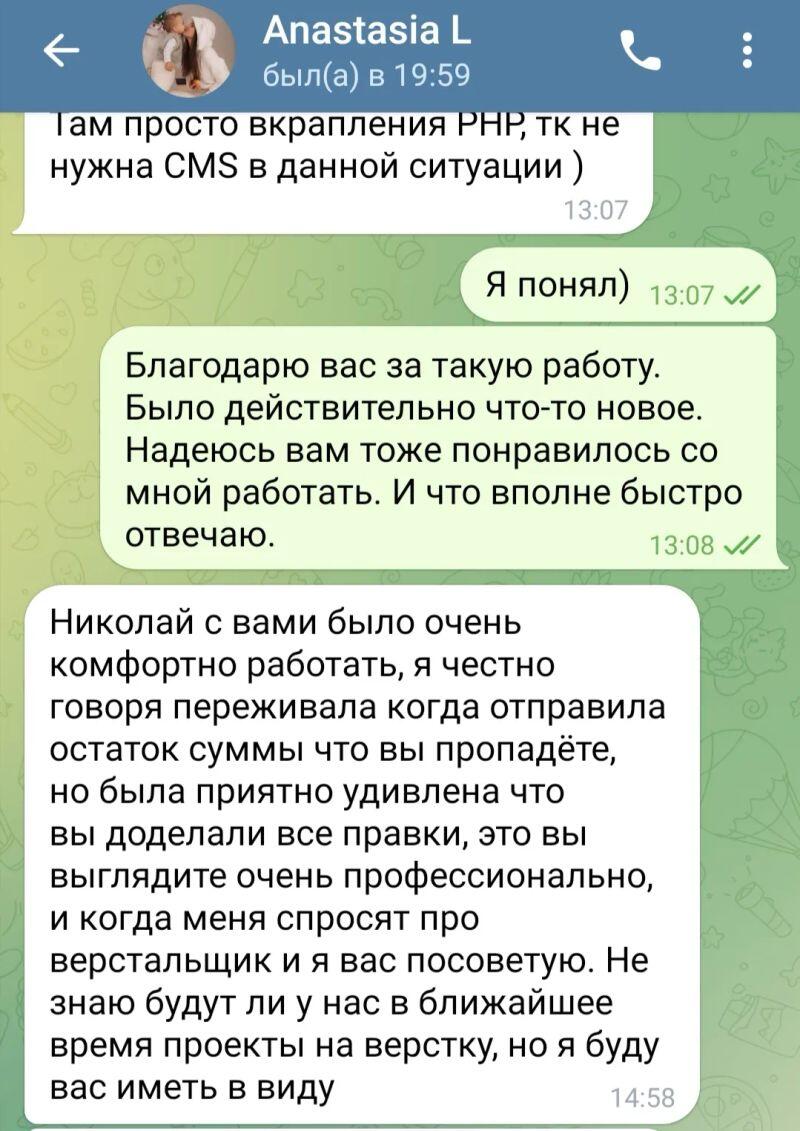 Профессиональная и качественная работа! Верстка сайта выполнена точно по требованиям, с учетом всех деталей и сроков. Рекомендую!