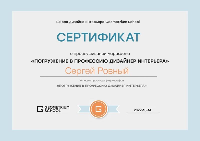 - Школа дизайна интерьера Geometrium School, марафон «Погружение в профессию дизайнер интерьера», 2022 г.