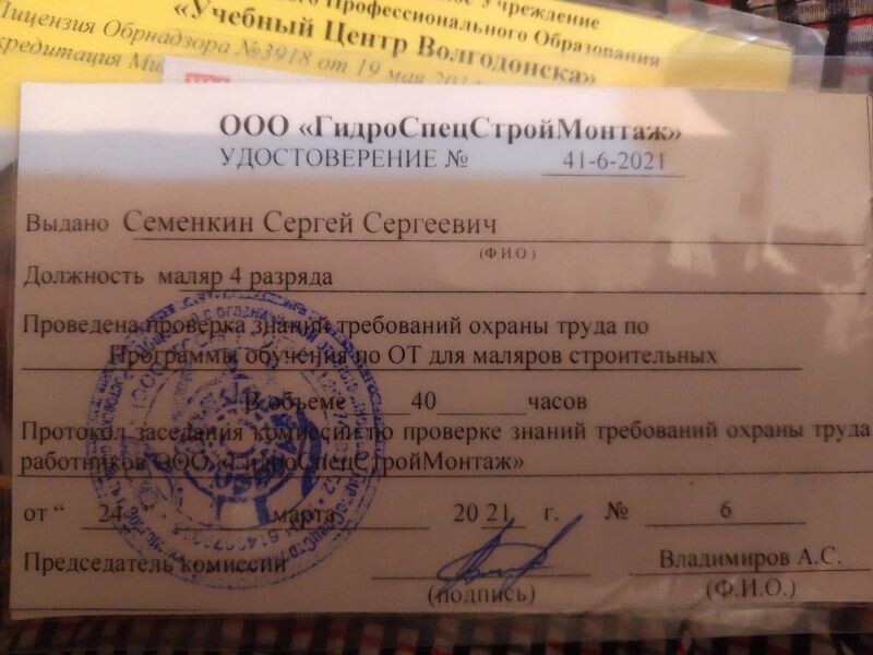 - ООО «ГидроСпецСтройМонтаж», маляр 4 разряда, 2019–2021 гг.