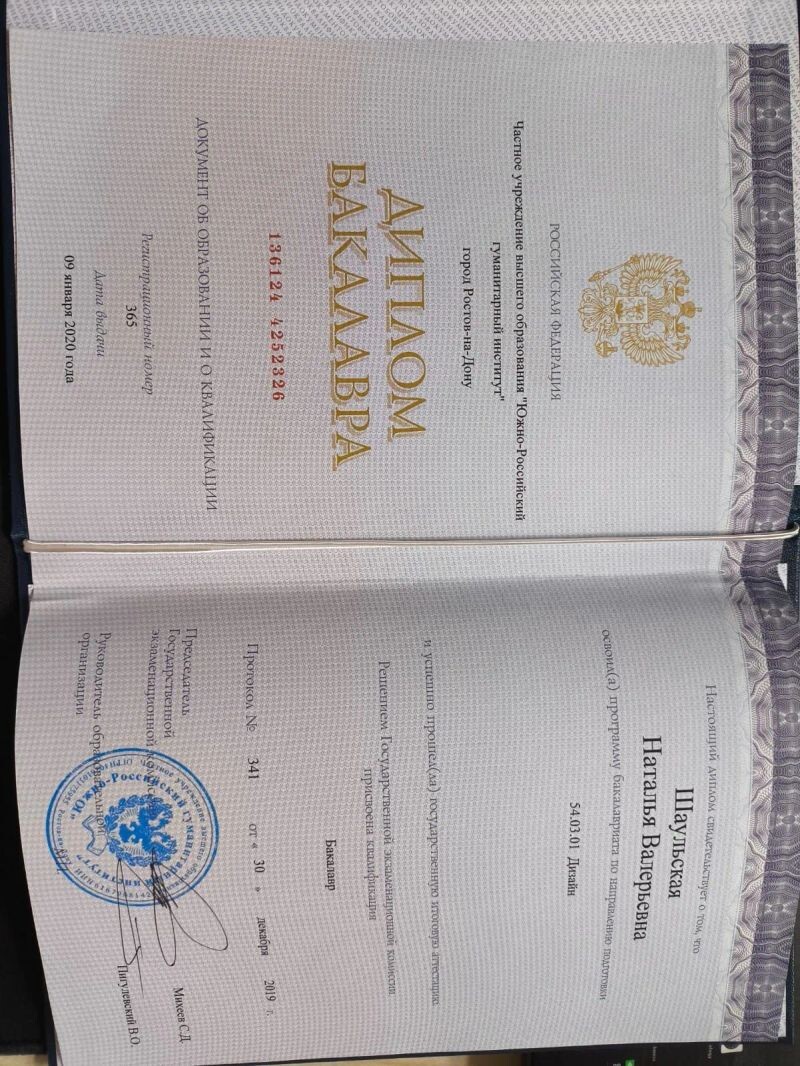 - Южно-Российский гуманитарный институт, дизайн, бакалавр, 2013–2019 гг.