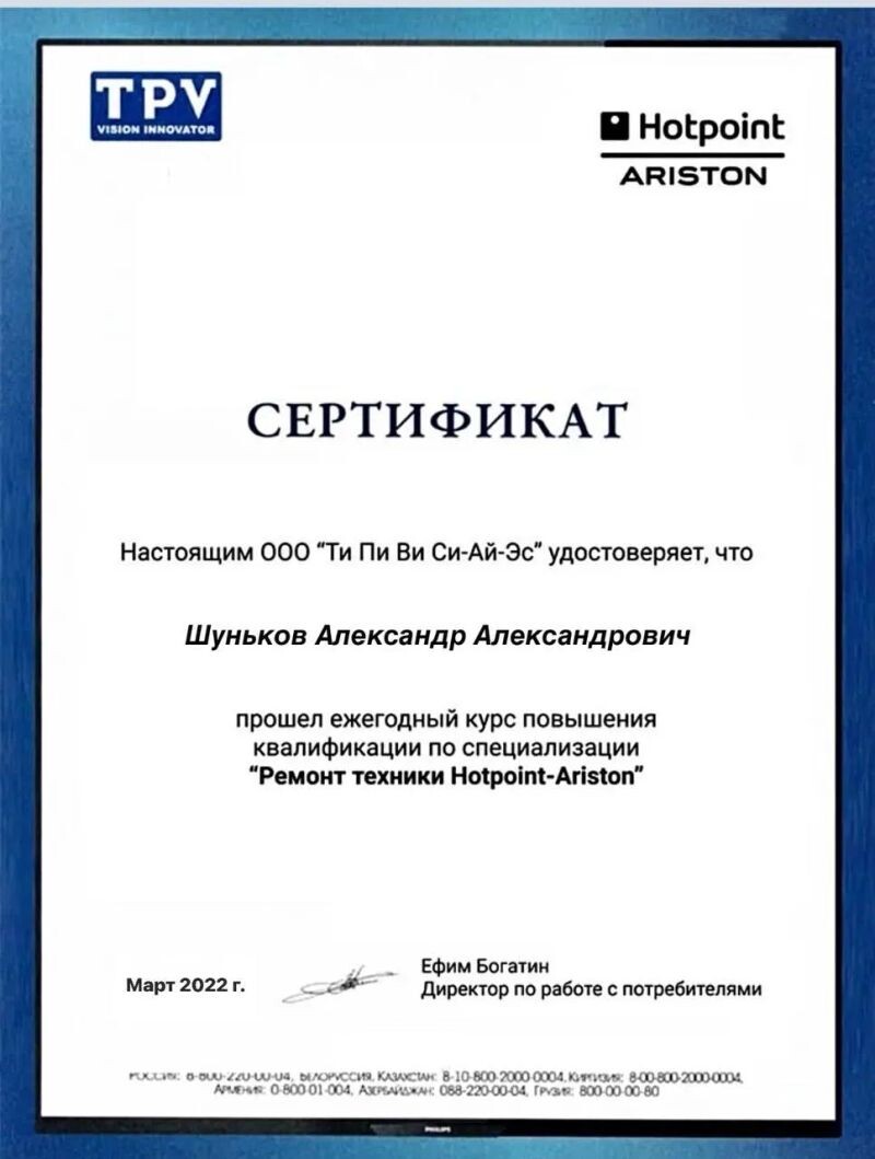 - ООО «Ти Пи Ви Си-Ай-Эс», курс повышения квалификации по специализации «ремонт техники Hotpoint-Ariston», 2022 г.