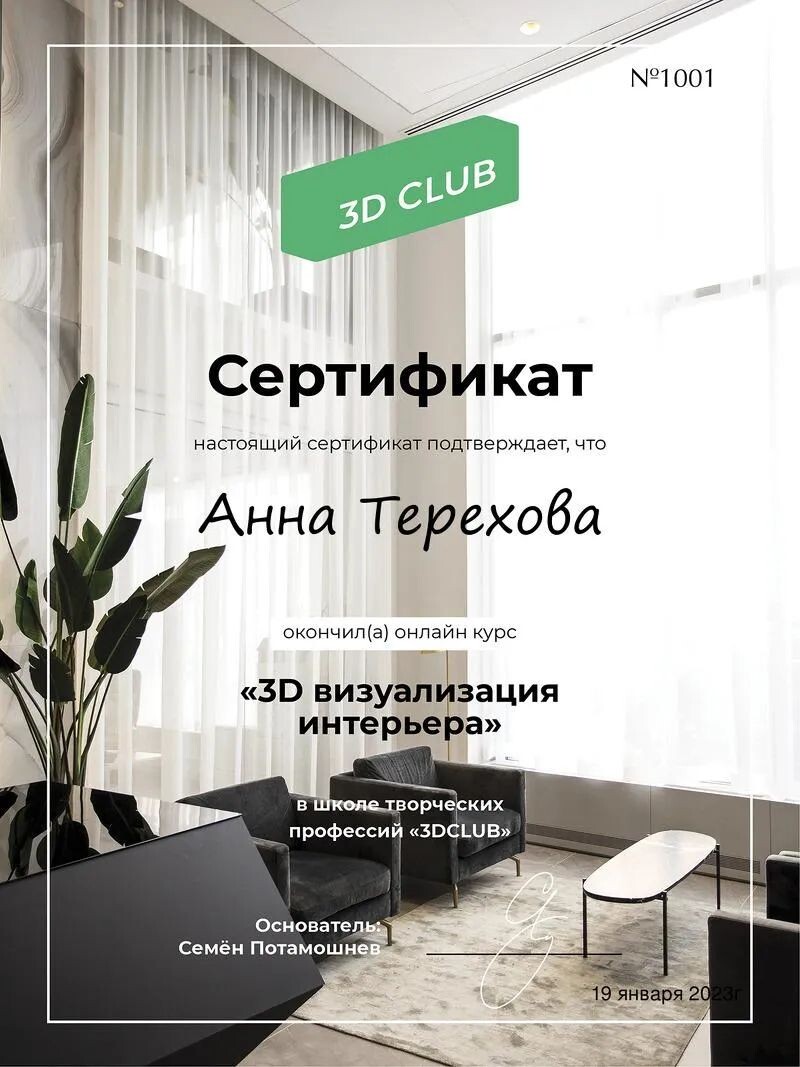 - Школа творческих профессий 3D Club, курс «3D визуализация интерьера», 2023 г.