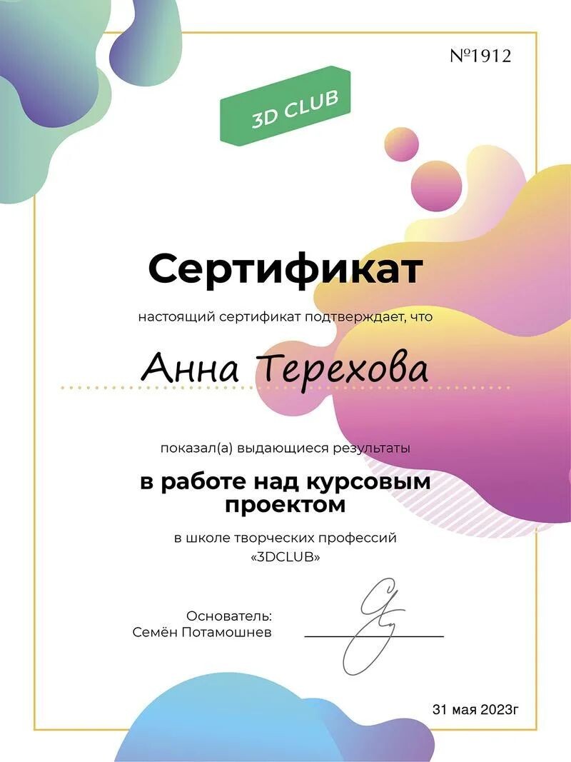 - Школа творческих профессий 3D Club, выдающиеся результаты в работе над курсовым проектом, 2023 г.