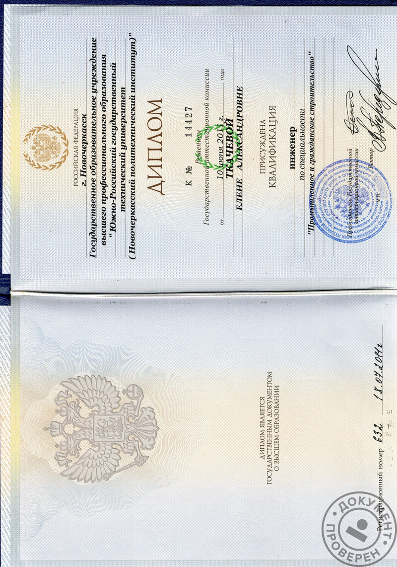 - Южно-Российский государственный технический университет, специальность – ПГС, инженер-строитель, 2011 г.